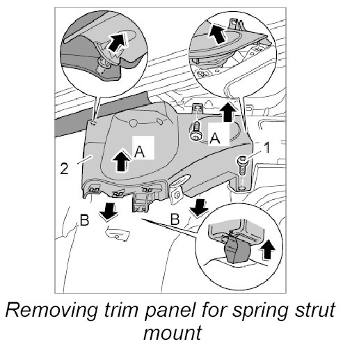 2. Unclip trim panel for spring strut mount -2- first upwards -Arrows A- and then pull out slightly in -direction of Arrow B-.