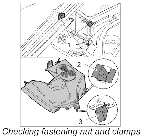 4. Check fastening nuts -1- and clamps -2, 3-, and replace if necessary.