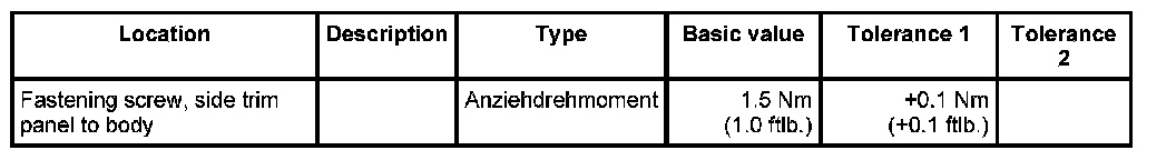 1. Insert side trim panel -1- with locking tab -2- and rubber sleeve -3- into the inner side member and then screw into place with the fastening screws -4-. Anziehdrehmoment: 1.5 Nm (1.0 ftlb.)+0.1 Nm (+0.1 ftlb.)