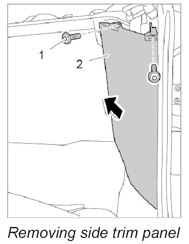 1. Unscrew fastening screws -1-, lift side trim panel -2- from lower side member and pull out.
