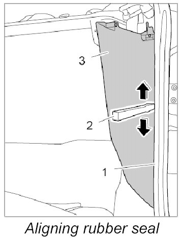 2. Lift up the rubber seal for the door -1- using a plastic wedge -2- along the side trim panel -3-.