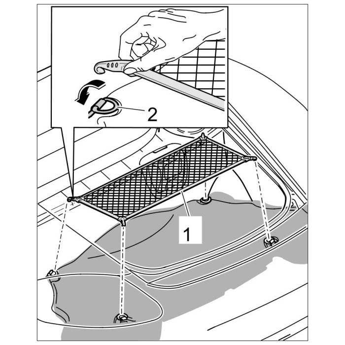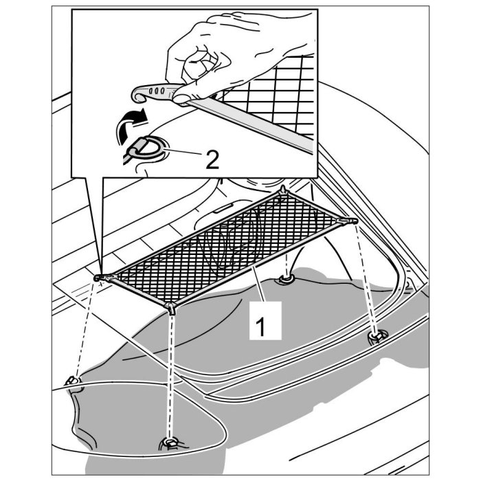 1. Position luggage net -1- and engage in the tie-down eyes -2-.