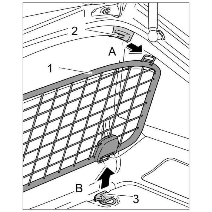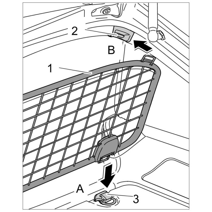 1. Insert luggage mesh -1- right and left in the mounting saddle -3- -Arrow A- and then engage in the bodyshell hooks -2- -Arrow B-.
