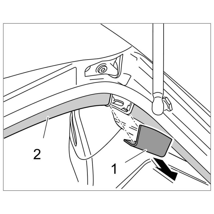 6. Push cover -2- right and left fully onto the bodyshell hooks -1-.