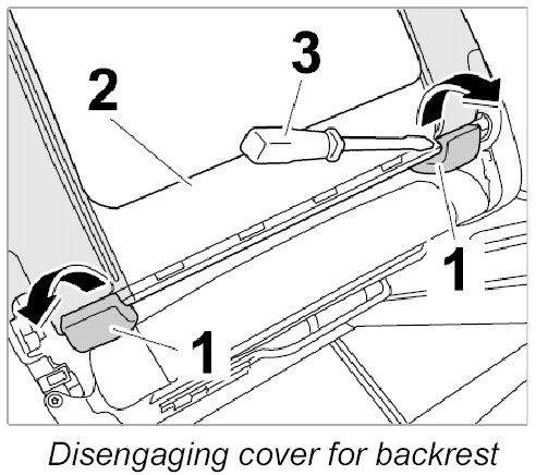 1. Press out cover for backrest -1- from the backrest shell -2- lower left and right using a screwdriver -3-.