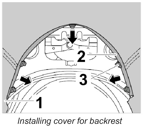 6. Press cover for backrest -1- into the backrest shell -2- lower left and right using a screwdriver -3-.