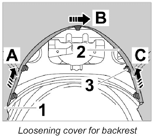 4. Push out plastic strip -2- on cover for backrest -1- from the fixing clips -3- in direction of arrow -A, B, C-.