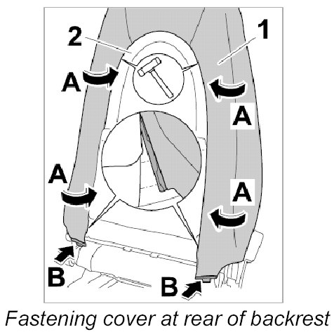 7. Engage connection of backrest cover -1- at the bottom into the cushion carrier -Arrows B-.
