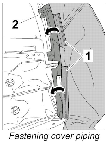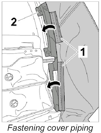 4. Engage cover piping -1- right and left into backrest frame -2-.