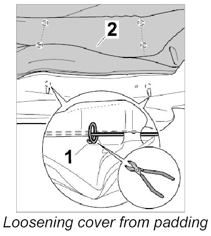 4. Cut open cushion clips -1- with side cutters and remove cover -2- from padding.