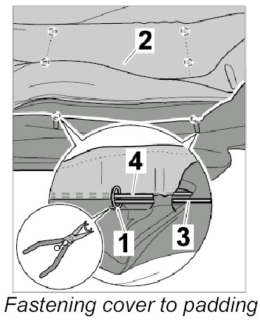 2. Use the cushion clip pliers NR.130 and the cushion clips -1- to connect the integrated metal struts of the padding -3- with the metal struts of the cover strips -4-.