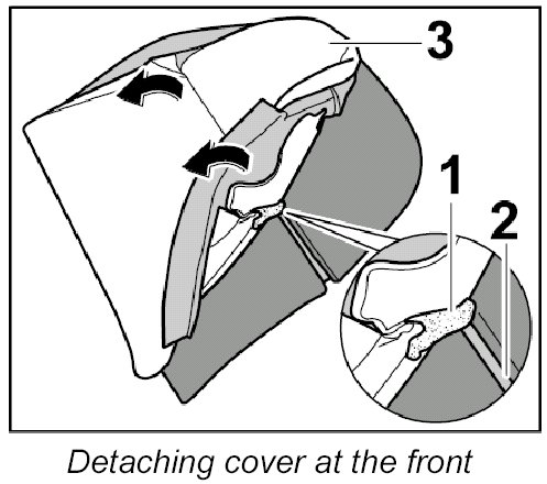 3. Carefully detach Velcro strip -1- on the cover from the Velcro fastener on the front of the padding -2- (-arrows-).