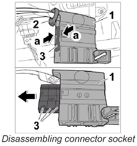 6. Release connector socket -1- (-arrows a-) and remove the three individual connectors -3-.