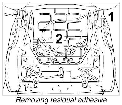 3. Remove residual adhesive -1- and clean sealing surface of seat frame -2- with cleaning agent.