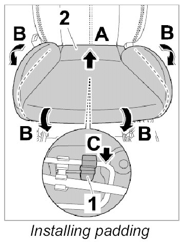 3. Clip in fixing clip -1- underneath the padding -2- (-arrow C-).