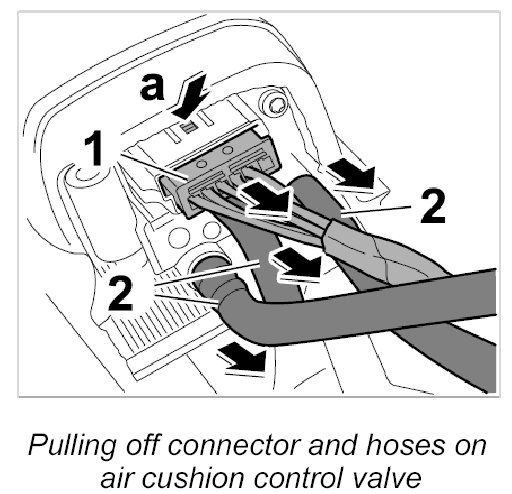 3. Release connector -1- on air cushion control valve -arrow a- and pull it off.
