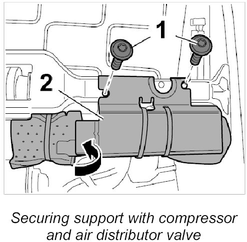 4. Position support -2- with connected motor and air cushion control valve and screw down with the two fastening screws -1-.