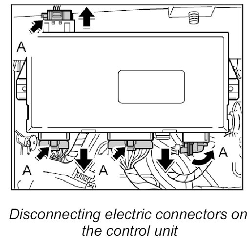 2. Release electric connectors -A- on the control unit and disconnect them.