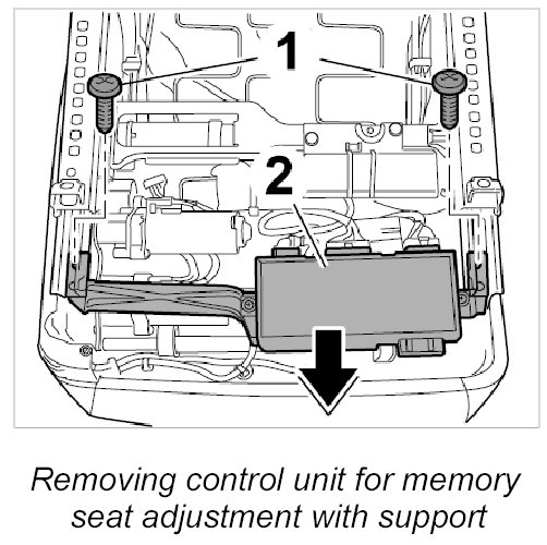 1. Unscrew the two fastening screws -1- and remove control unit for memory seat adjustment together with the support -2- from the seat frame.
