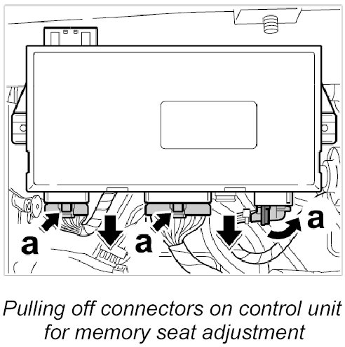 2. Unlock and pull off the three connectors on the control unit for memory seat adjustment -arrows a-.