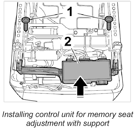 2. Position control unit for memory seat adjustment with support -2- on seat frame and secure with both fastening screws -1-.