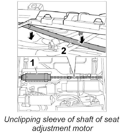 1. Unclip sleeve of long drive shaft -2- of seat adjustment motor -1- at the support.