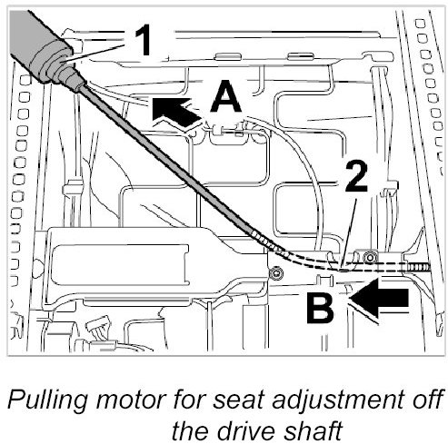 3. Pull motor for seat adjustment -1- off the short drive shaft -arrow B-.