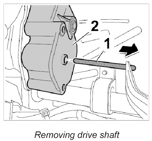 6. Pull the long drive shaft -2- out of the gear mount -arrow B- and check for damage.
