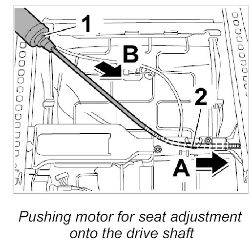 5. Push motor for seat adjustment -1- under the support -2- (-arrow B-).