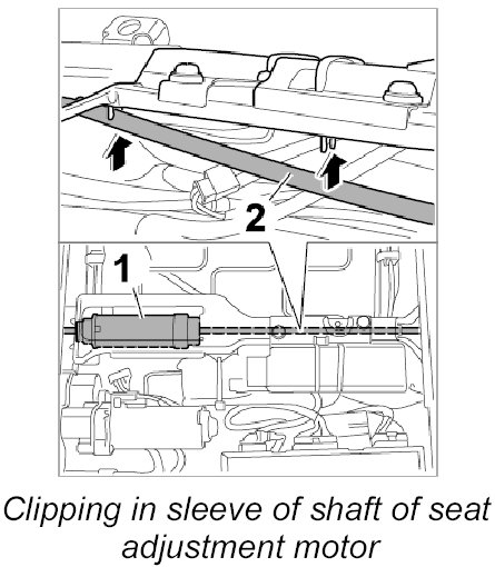 8. Clip in sleeve of long drive shaft -2- of seat adjustment motor -1- on the support.
