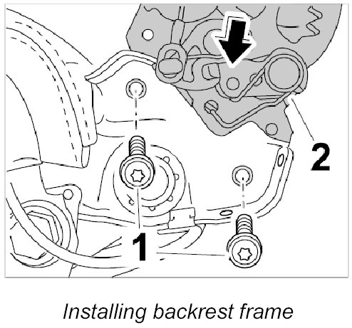 1. Fit backrest frame -2- into the seat frame, position it correctly and secure with the fastening screws -1-. Tightening torque: 34 Nm (25 ftlb.)±4 Nm (±3 ftlb.)