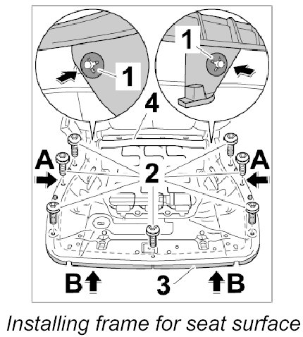 1. Position frame for seat surface -3- on the seat frame -4- (-arrow A-), press it upwards -arrow B- and screw down the fastening screws -2-.