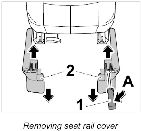 2. Pull seat rail covers -2- on right and left seat rails off in forward direction.