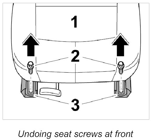 1. Move seat -1- to its rear limit position and undo the front fastening screws -2- from the right and left seat rails -3-.