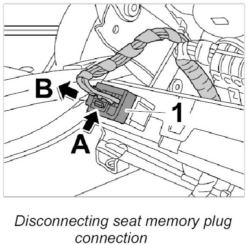 1. Release electrical plug connection -1- by activating the locking tab -arrow A- and remove from seat memory control unit -arrow B-.