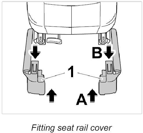1. Push seat rail cover -1- into front end of the left and right seat rails -Arrow A- until the locking tab audibly engages -Arrow B-.