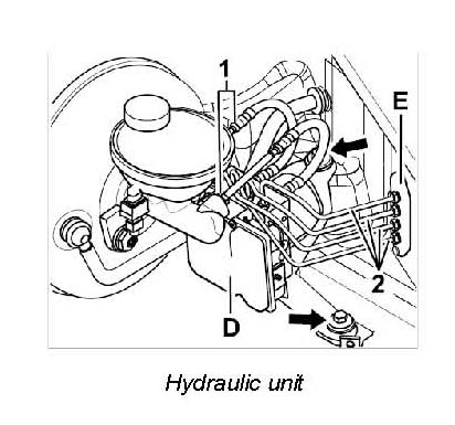 Remove hydraulic unit -D- together with the support and the four brake lines, which are fitted on the intermediate piece -E-.