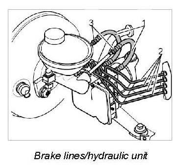 1.5. Fit the brake line -1- on the hydraulic unit first and then on the brake master cylinder and tighten to 25 Nm (19 ftlb). (increased from 20 Nm (15 ftlb.).