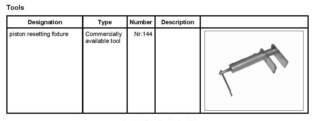 2. Use the piston resetting fixture Nr.144 to push brake pads back slightly and uniformly -direction arrow-. Make sure that no brake fluid runs out of the supply tank - drain it if necessary.