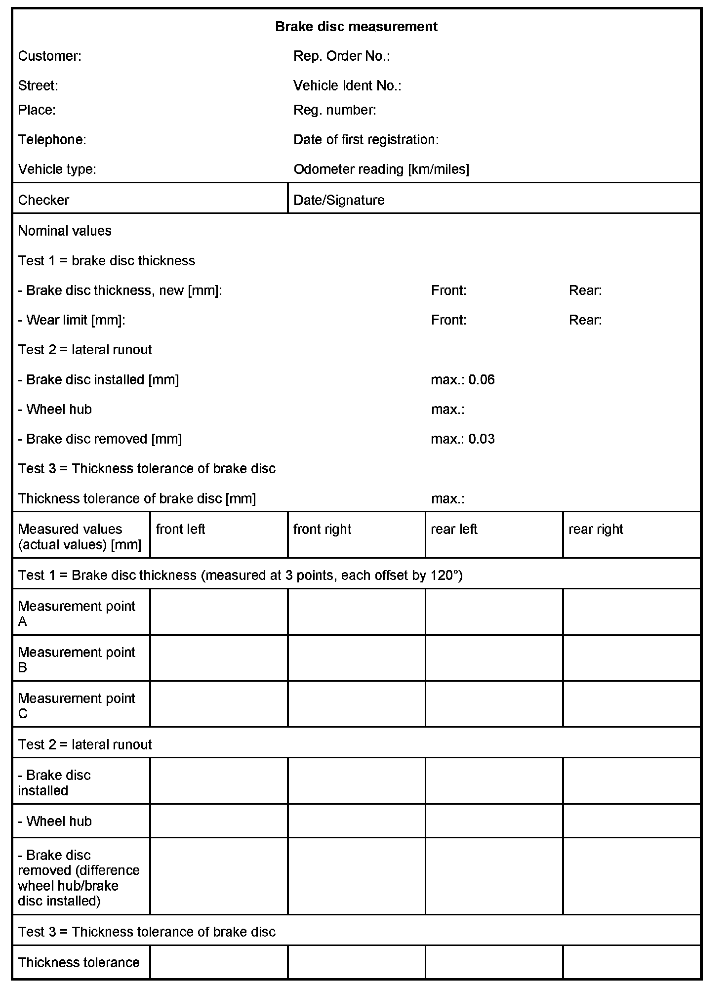 WM 460000 Brake disc measurement sheetInformation