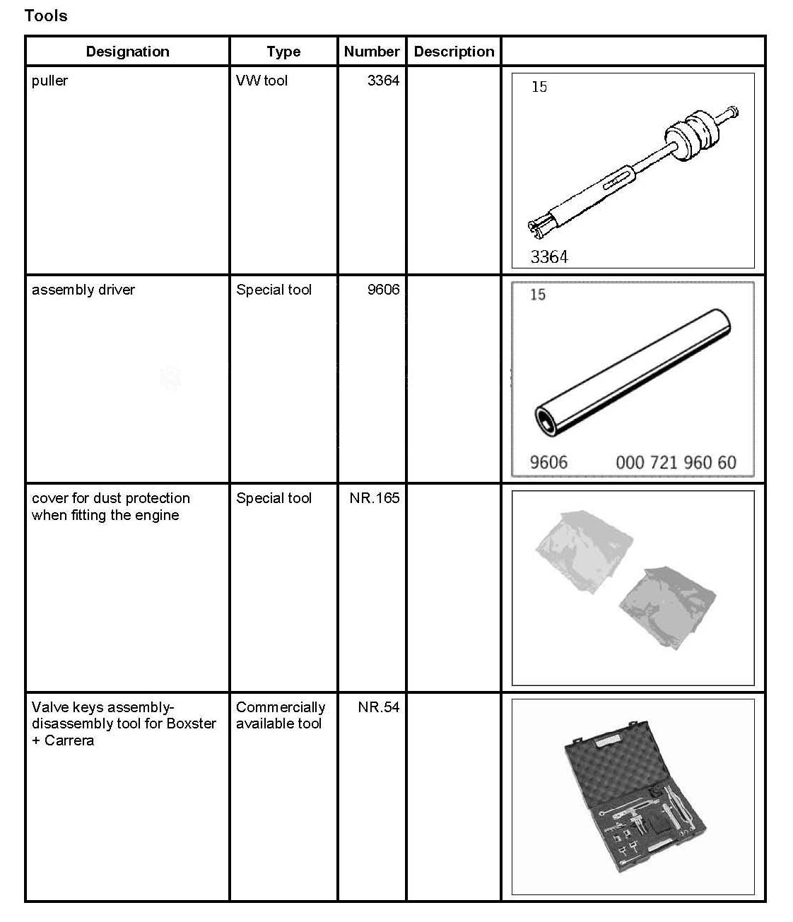 The following tool is used and recommended for the described work: commercially available tool Valve keys assembly- disassembly tool for Boxster + Carrera NR.54 (Sauer Co., Art. No. for standard case 600 50 00).