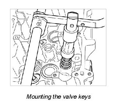 5. Place disassembly head on upper valve-spring plate and press together the valve springs with the lever arm. The valve keys and the concave washer stick due to the magnetic insert on the disassembly head. Repeat this process by moving the joint at the required valves.