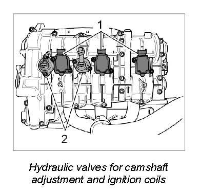3. Remove holder and retainer plates (with integrated seal) for the solenoid hydraulic valves (camshaft adjustment and valve lift control) -2-.