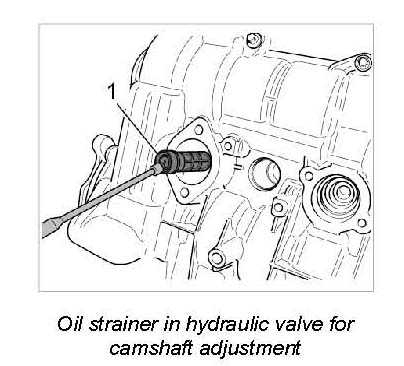 4. If the solenoid hydraulic valve for camshaft adjustment is removed, the oil strainer -1- must be checked for damage and contamination, and replaced if necessary.