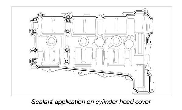 2. Prepare cylinder head cover for assembly. Apply a thin bead of sealant on the cylinder head cover (not more than 1.5 mm high).