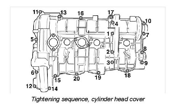 5. Position 20 Torx screws (eight of these should be new, coated screws -1-4 and 7-10-) on the cylinder head cover and tighten according to the specified tightening sequence. Only lightly screw in the two screws in the area of the oil suction pump/tandem pump. They will be tightened after the pump is assembled.