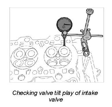 2. Check valve tilt play on intake valve. Adjust the dial gauge to the relevant angle of the valve to be checked and set to '0' with preload. Press valve disc towards dial gauge and pull it back again. Read off value and note it.