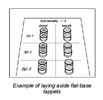 ^ Re-insert flat-base tappets in the fitted bores in which they were positioned before the disassembly. The flat-base tappets have been run in in the fitting bores in the housing and therefore may not be switched.