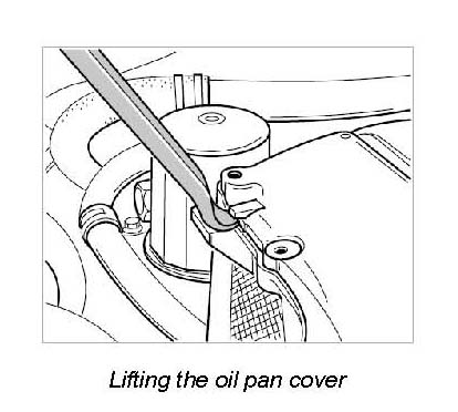 66. Unscrew 13 Torx screws M6 x 20 on the oil pan cover. Tap cover gently on the sides using a plastic hammer, then carefully lift it at the leverage bar Lifting the oil pan cover using a plastic-coated mounting lever and remove the oil pan.