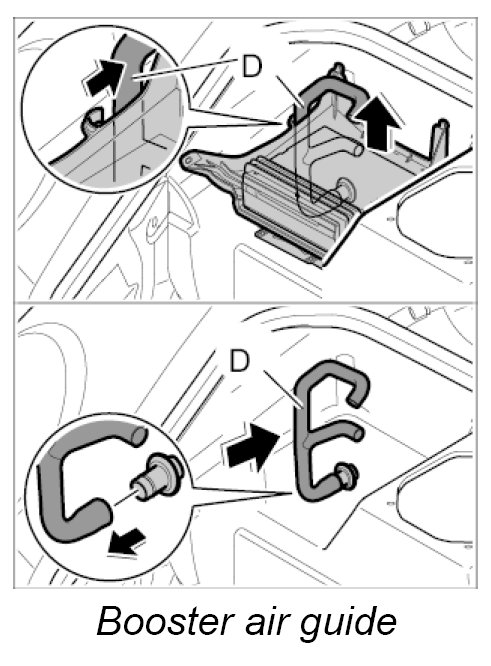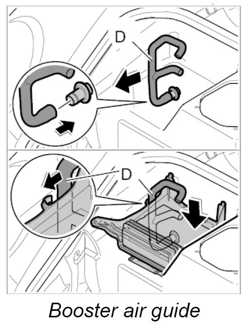 2. Route booster air guide -D- around the body and insert into the upper air guide.